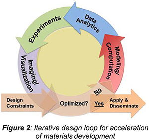 The overall challenge in this area is the development of multiscale theories and computational tools capable of handling several orders of magnitude in length scales (Ångstrom to mm) with required fidelity to fully integrate with and be informed by experimental studies. The national vision of materials design has prioritized the use of modeling and computation, integrated with physical experimentation and cyberinfrastructure. Since the properties of a material are determined by its structure at different length and time scales, our goals are the development of advanced multiscale theoretical foundations, fast algorithms to handle high throughput computations, high resolution/fidelity imaging and visualization, andbig data analytics including uncertainty quantification. These models and tools must not only bridge the physics across multiple scales, but also be fully integrated with experimental observations and materials genome databases via an iterative design loop (Figure 2). A lasting legacy will be the availability of the developed computational tools and the database (e.g., Materials Data Bank, MDB, discussed below) to the broad materials research community.
