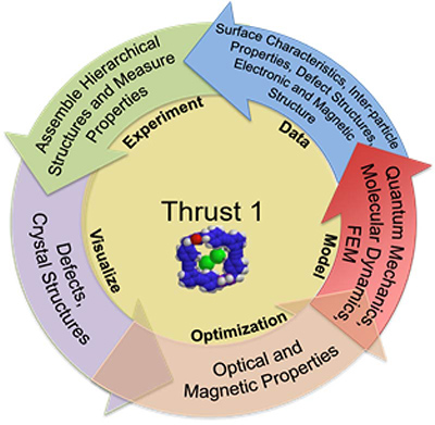 The overall scientific challenge for Thrust 1 is to develop the fundamental computational and experimental science to guide the development of hierarchical materials that exhibit designed optical, electrochemical and magnetic properties not attainable in current materials. Thrust 1 will develop the fundamental science from which new functional materials with collective response will emerge. It will build upon existing expertise in crystal growth, synthesis of functionalized nanoparticles, and directed self-assembly of 3D structures to control and modify the collective magnetic and optical properties exhibited by structures ranging from Angstroms in atom-based structures to hundreds of nanometers. The overall goal of this thrust is to create the knowledge needed to assemble 3D structures in a controlled and predictive fashion, applying theory and modeling to deliberately alter their properties, and developing the ability to assemble nanoparticle building blocks into hierarchically organized 3D structures with targeted optical, electrochemical and magnetic properties.