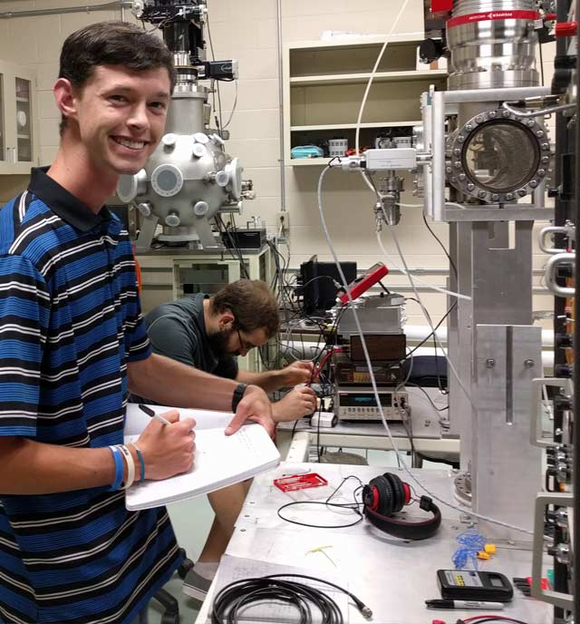 In these photo, REU student Daniel Fox is taking data with an Argon ion beam and a charged particle detector. The other student shown in the photo is Marler’s graduate student Steve Bromley.